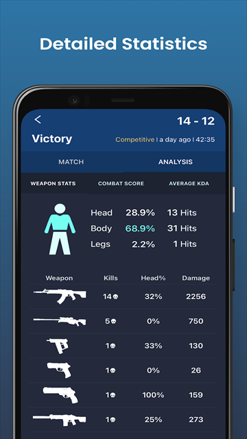 3、查看每场比赛的详细信息,包括记分板、武器统计数据(如暴头率)。将您的洞察数据与许多其他数据进行比较。