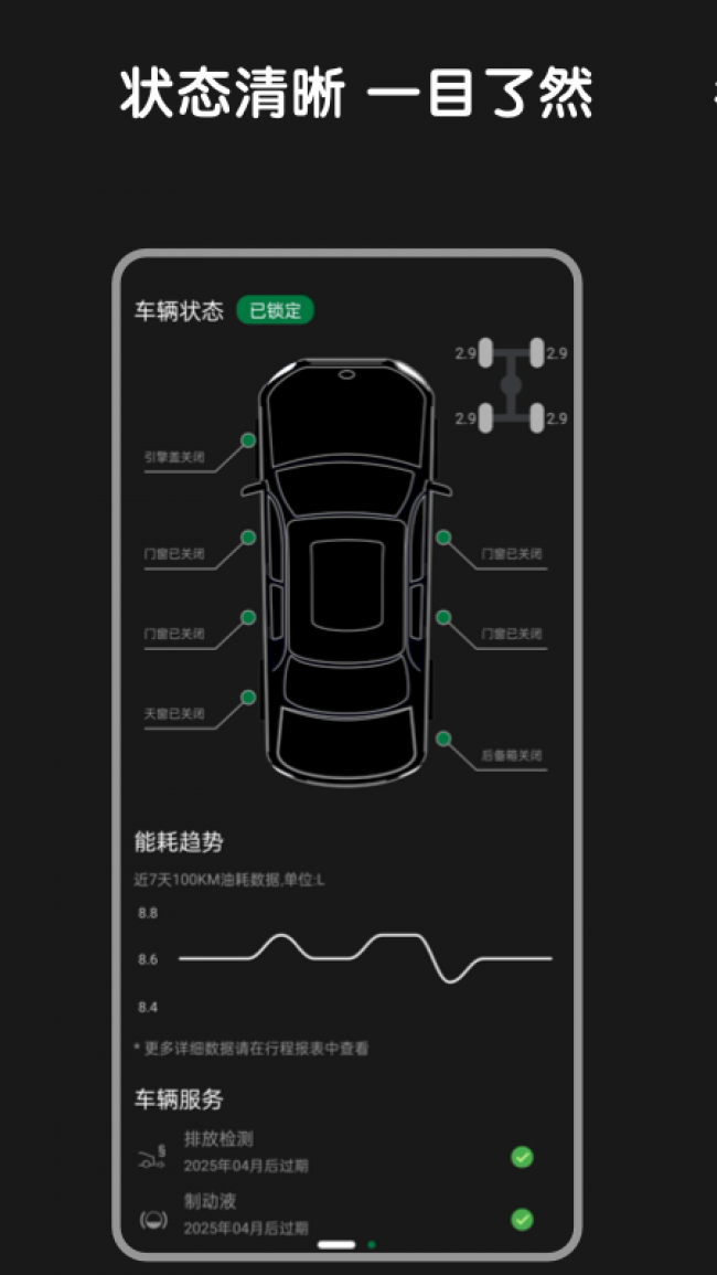 2、车辆控制,可以帮助用户控制门锁、上锁、空调的状态等。