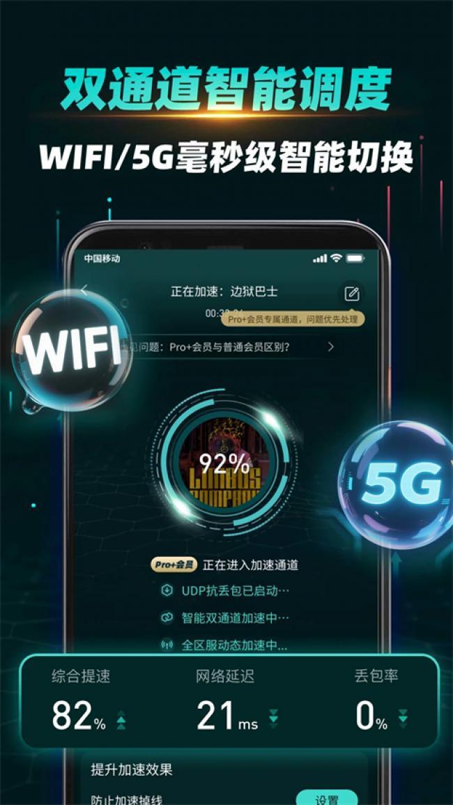 3、OurPlay加速器Pro+通过自主研发的UDP动态冗余编码算法,首次实现「双通道智能补偿」。