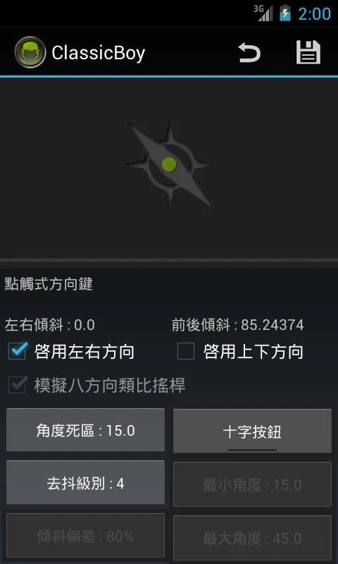 2、当切换到手势控制模式时,屏幕的左侧区域用于控制方向,右侧区域用于控制移动,每侧可以检测到八个手指滑动方向,每个方向都可以映射到一个游戏按钮。
