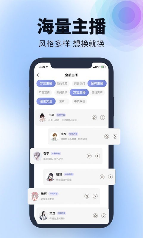 1、它提供在线文字转语言功能,只需要输入文字,就可以一键配音,快速准确地合成专业优质的音频。