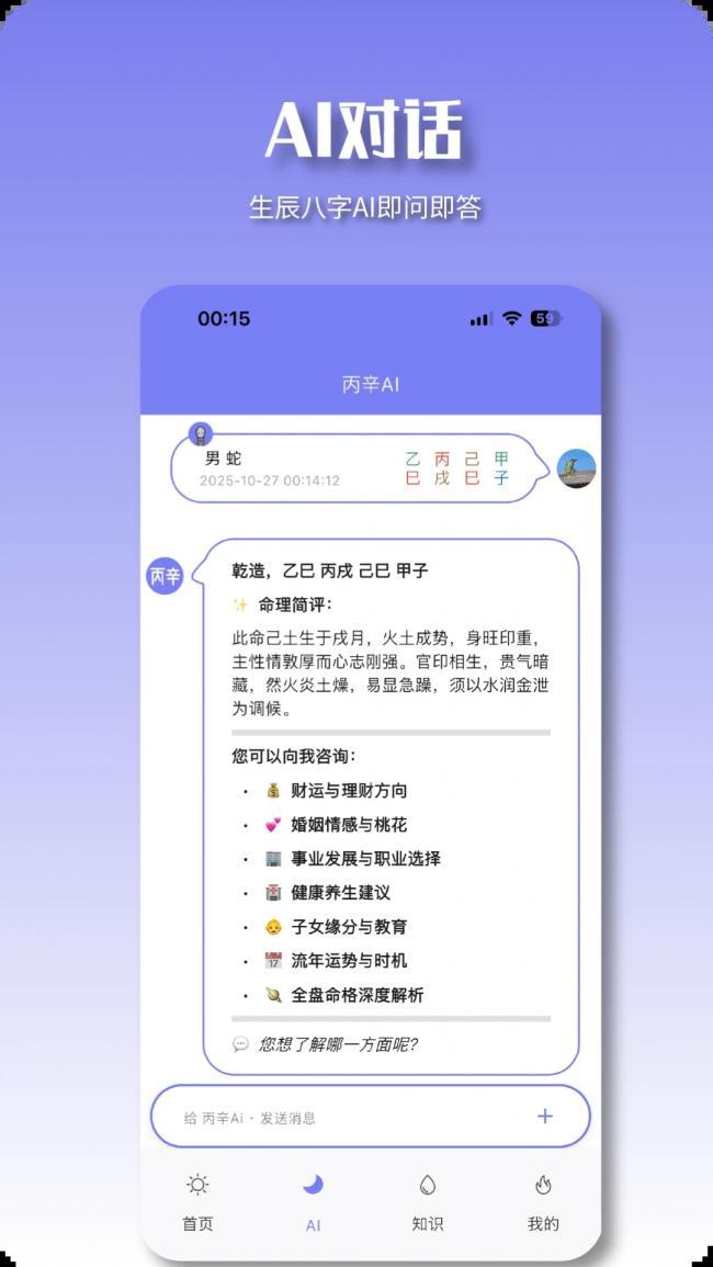 丙辛排盘app下载是一款非常强大且智能的AI排盘测运软件,旨在为用户提供更加专业便捷的八字排版服务,随时都能够在应用当中开启自由的排盘操作,帮助你垮丝获取运势和命里信息,方便于能够高效的掌握个人运势,并且能够抓住每一次机会,帮助用户在生活或者工作当中更加的顺利,其中还拥有强大的AI对话模式,可以通过发送信息的方式咨询信息,带你深度了解生辰八字,为你讲解更加的细腻,详细的排盘信息,直观简洁的操作界面,所有的信息都可以一览无余,同时每一次排盘的信息都会被保存下来,随时都可以在其中进行查看,了解信息更加方便。喜欢的伙伴们快来下载试试吧。