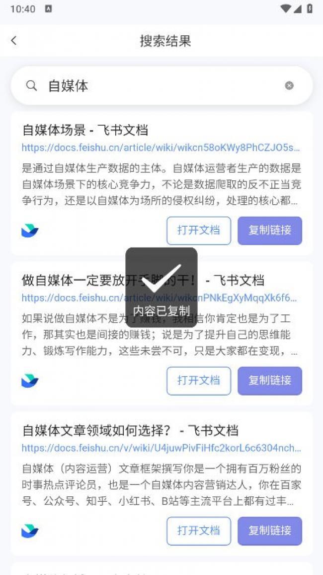 3、界面简洁,输入关键词即可搜索,结果直接呈现飞书文档链接,无需复杂权限配置。