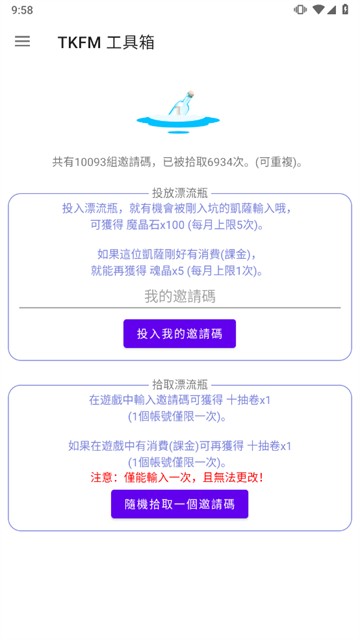tkfm工具箱安卓版是一款非常实用的游戏辅助工具,它可以为玩家提供最新的游戏资讯信息,玩家无需登录游戏就可以第一时间了解尽情游戏动向,TKFM工具箱内有角色数据计算器、角色评价表生成器、虚宝码和邀请码等功能,可以为用户带来优质的游戏体验,界面设计简洁干净,操作简单方便,小白也能快速上手,为你带来优质的游戏体验,界面设计简洁干净,可以帮助玩家收集最全最新的虚拟资源码,不需要任何费用,可以一键复制粘贴,让你可以更高效的获取各种福利,轻松满足用户的使用需求,带来优质的使用体验,感兴趣的用户可以立即在软件站下载!