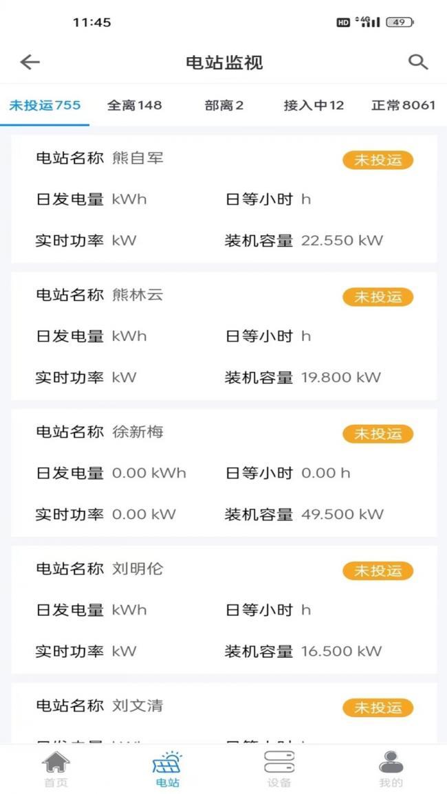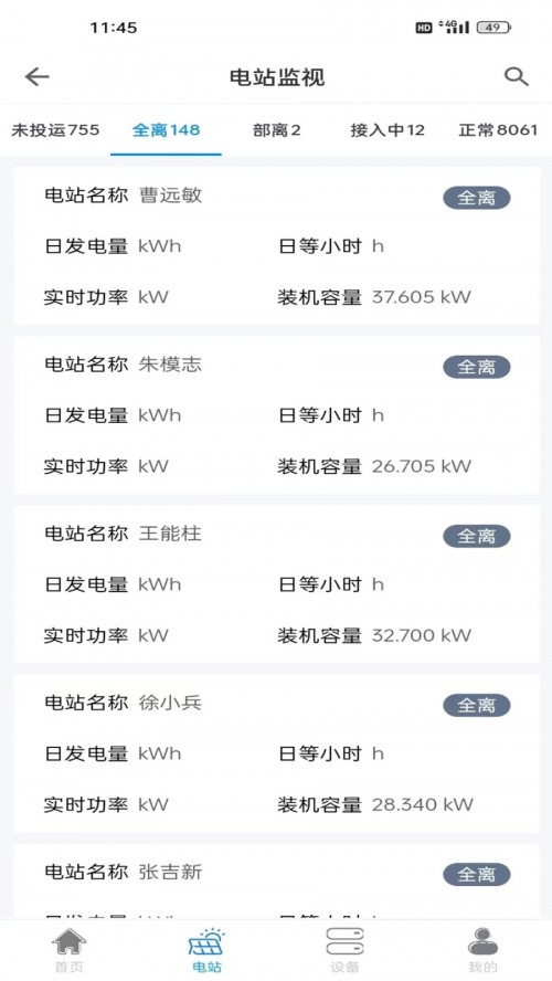 3、可以通过电站监视对设备的在线与离线状态进行监视,查看所有电站的状态信息。