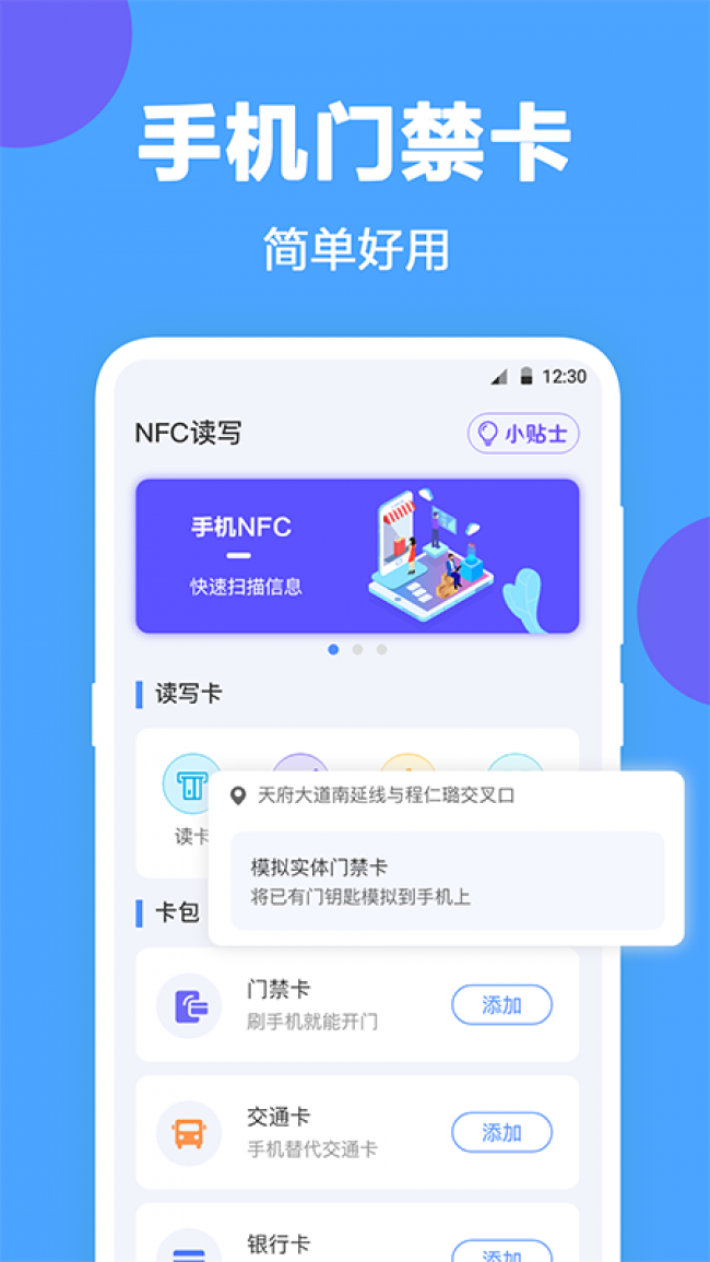 1、能将手机变成随身钥匙,实现门禁卡、公交卡等的数字化管理,解决用户携带多张实体卡的不便。