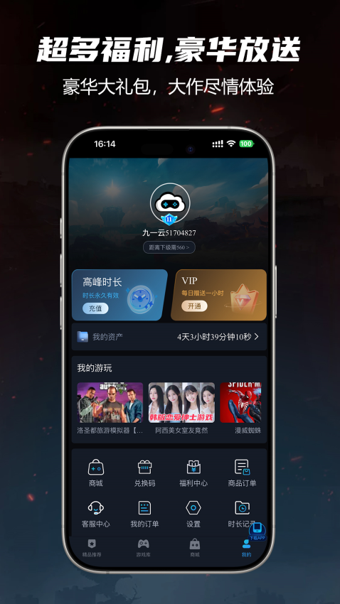 1、九一云游app每天提供免费游戏时间,用户可零成本享受高质量游戏体验。