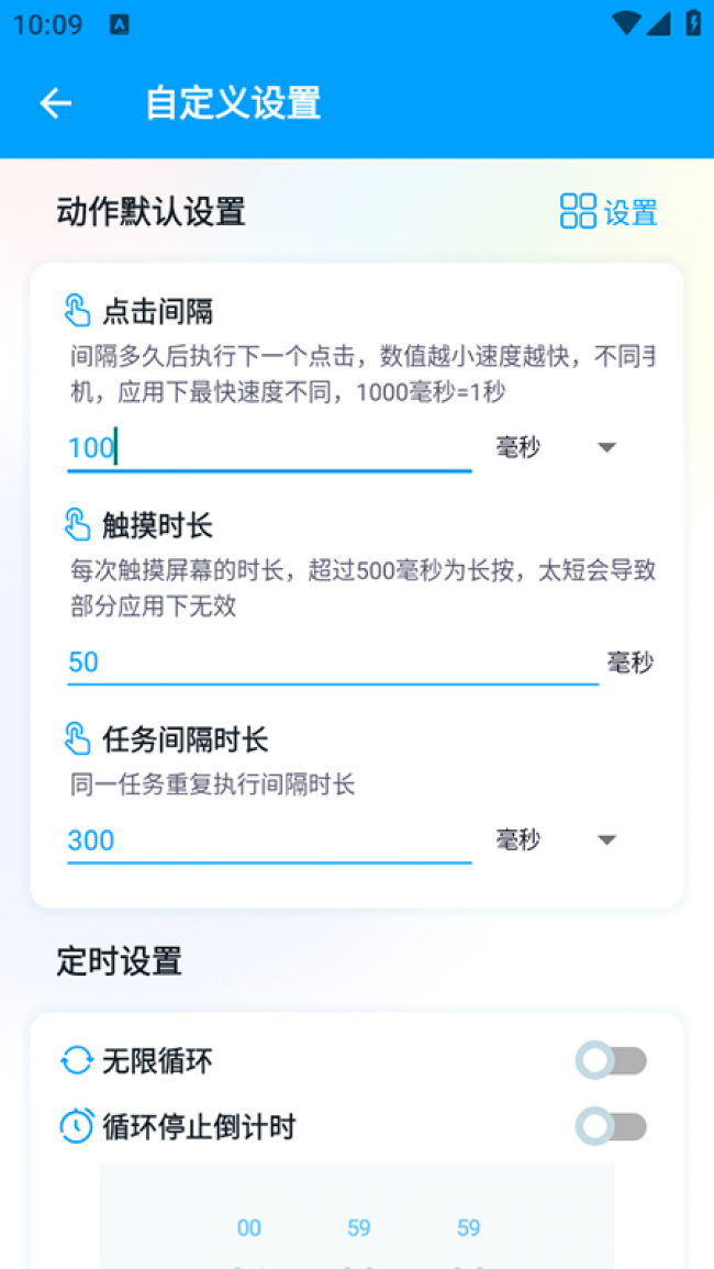 3、悬浮窗透明度调节、音量键启停、来电暂停、屏幕常亮、运行结束震动提醒等。