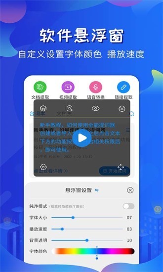全能提词器app下载是一款专为短视频创作者设计的便捷提词工软件,有效的帮助用户提升录制的体验感,操作也是非常的简单,用户可以轻松导入台词文本,使用悬浮窗功能进行实时的提升,还可以灵活调整字体大小、颜色以及字幕滚动的速度,保证了用户可以更加清晰流畅的表达出词汇,非常适合那些做自媒体的工作者,其中还可以为你提供文案提取、语音转文字等多种功能,能够有效解决台词遗忘或发音不准确的问题,在这里可以为你的创作添加更多的助力,让你自信展现出最佳的状态,有效的提升了用户拍摄的流畅度,节省的大量的精力和时间。喜欢的伙伴们快来下载试试吧。