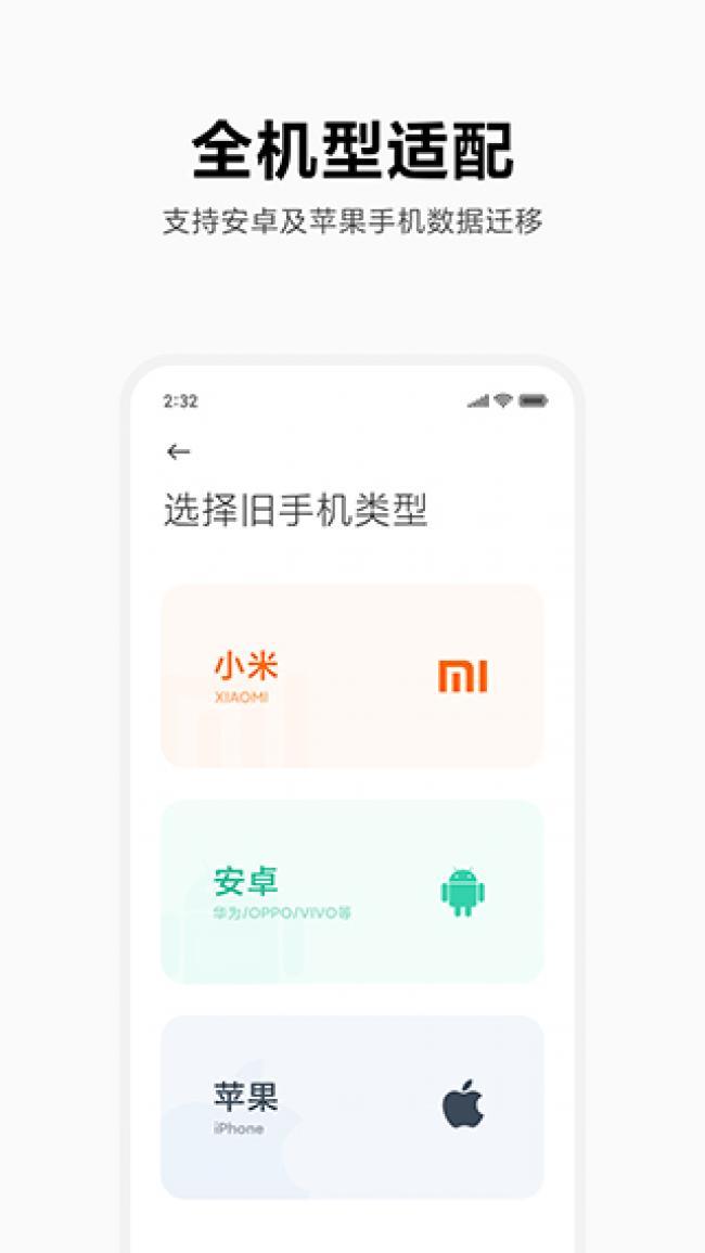 3、小米换机app官方下载全机型适配,可支持Android和Apple手机数据迁移,选择老机型,打开传输。