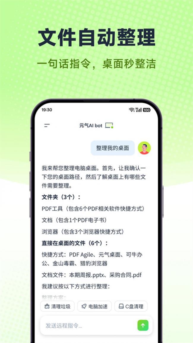 元气AI Bot下载安装是一款功能强大的智能手机管理软件,其中采用了最先进的智能AI技术,帮助你轻松管理手机和电脑上的内容,操作方式也是非常的简单,只需要通过手机和电脑连接就可以进行实时的管理,而且不需要任何复杂的操作,只需要通过语音进行输入就可以轻松帮助你管理电脑,打破了时间和空间的距离,按住输入窗口输入语音内容,就可以快速解决你需要的问题,不仅可以帮你整理文件、查询资料,还可以将所有的内容全部都同步到手机当中,随时进行查看,极大的提升了用户工作效率,为你带来智能化办公体验,非常的方便切高效。喜欢的伙伴们快来下载试试吧。