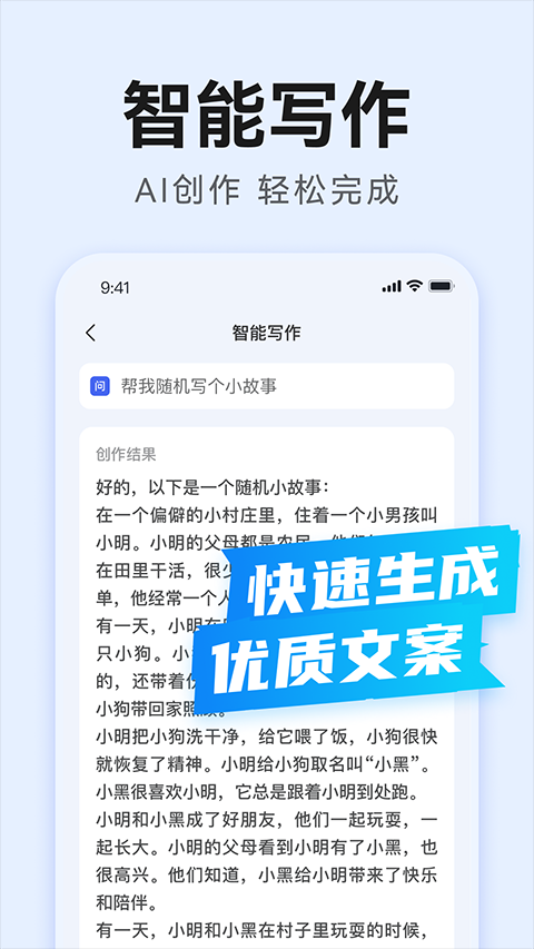 1、AI写作助手app官方下载会根据用户的需求进行文案创作,帮助你快速的创作对应的文案内容。