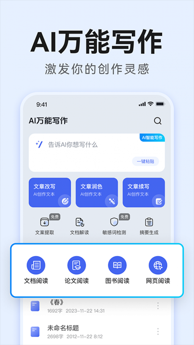 AI写作助手app官方下载是一款非常实用的智能AI创作软件,采用了最先进的智能AI技术,为你提供强大的文章创作功能,可以帮助用户创作出各种各样的文章内容,比如小说、对联、文案以及报告等多种文章,让你可以通过AI智能辅助快速完成创作,这样就可以帮助用户快速抓住自己的灵感,提升自己的创作能力,不需要任何复杂的操作,只需要将自己的创作灵感通过文字表达出来,系统就可以根据你的要求进行创作,并且还可以帮助用户对自己的文章进行优化,只需要提交文本内容就会自动进行扫描,进行修改优化减少文章中的瑕疵部分,提升文章质量。喜欢的伙伴们快来下载试试吧。
