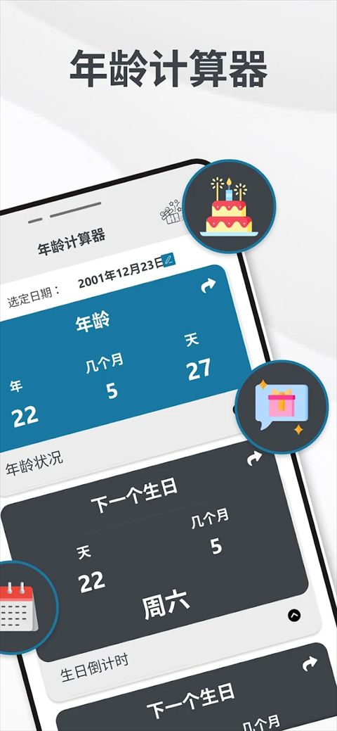 年龄计算器app下载安装是一款非常实用的年龄计算软件,能够帮助用户轻松计算出每个人的年龄是多少,计算方式也是非常的简单,只需要将出生年月日输入到其中,就可以快速得出精准的结果,非常的方便,还可以帮助你推算出下次生日还有多久,并且还可以为你开启生日倒计时,让你可以精准的了解到距离自己的生日还有多长时间,而且还可以帮助你推算出各种重要日期的时间,非常的方便,让你不会错过任何一个重要的日子,同时还可以将每一次的计算都进行云端同步,让你数据不会丢失随时进行查看,满足用户多种场景下的计算方式,非常的方便。喜欢的伙伴们快来下载试试吧。